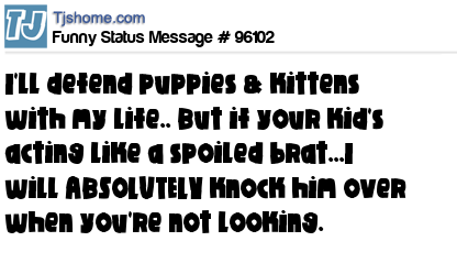 X I'll defend puppies & kittens with my life.. But if your kid's acting like a spoiled brat...I will ABSOLUTELY knock him over when you're not looking.