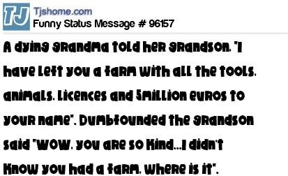 X says a dying grandma told her grandson, "I have left you a farm with all the tools, animals, licences and 5million euros to your name". Dumbfounded the grandson said "WOW, you are so kind...I didn't know you had a farm, where is it". "Facebook" she said!