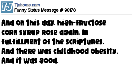 X And on this day, high-fructose corn syrup rose again, in fulfillment of the scriptures. And there was childhood obesity. And it was good.