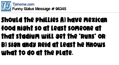 X Should the phillies A) have mexican food night so at least someone at that stadium will get the "runs" or B) sign andy reid at least he knows what to do at the plate.