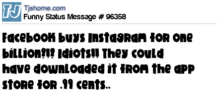 X is Facebook buys Instagram for one billion?!? Idiots!! They could have downloaded it from the app store for .99 cents..