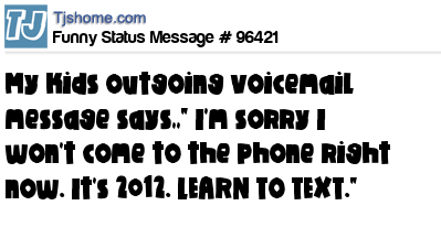 X  My kids outgoing voicemail message says,," I'm sorry I won't come to the phone right now. It's 2012. LEARN TO TEXT."