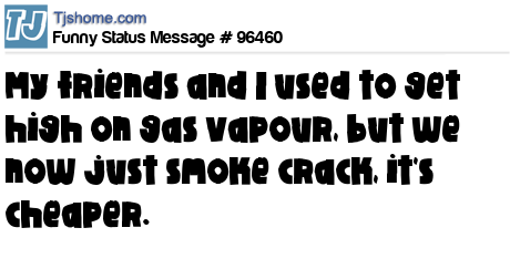X says My friends and I used to get high on gas vapour, but we now just smoke crack, it's cheaper.