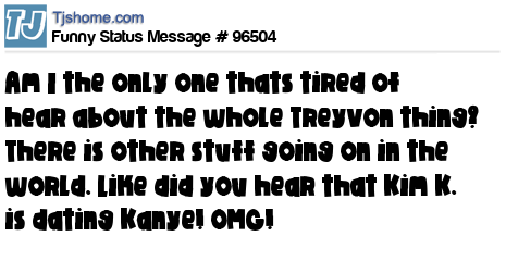 X Am I the only one thats tired of hear about the whole Treyvon thing? There is other stuff going on in the world. Like did you hear that Kim K. is dating Kanye! OMG!