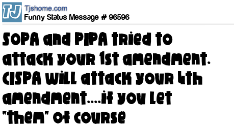 X SOPA and PIPA tried to attack your 1st amendment. CISPA will attack your 4th amendment....if you let "them" of course