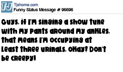 X Guys, if I'm singing a show tune with my pants around my ankles, that means I'm occupying at least three urinals, okay? Don't be creepy!
