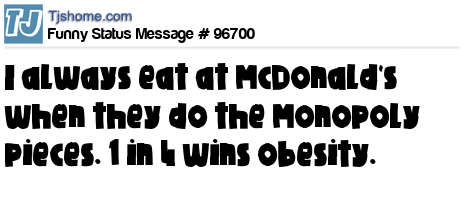 X I always eat at McDonald's when they do the Monopoly pieces. 1 in 4 wins obesity.
