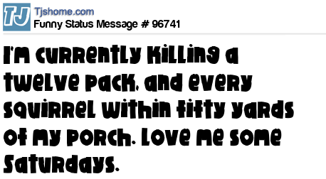 X I'm currently killing a twelve pack, and every squirrel within fifty yards of my porch. Love me some Saturdays.