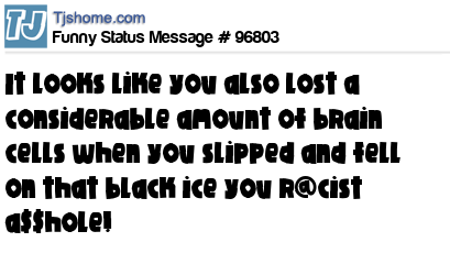 X It looks like you also lost a considerable amount of brain cells when you slipped and fell on that black ice you r@cist a$$hole!