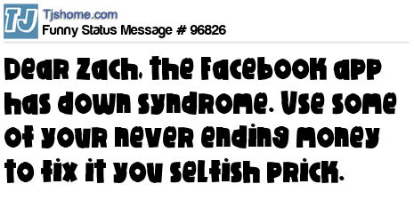 X Dear Zach, the Facebook app has down syndrome. Use some of your never ending money to fix it you selfish prick.