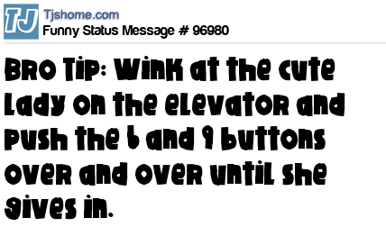 X is Bro Tip: Wink at the cute lady on the elevator and push the 6 and 9 buttons over and over until she gives in.