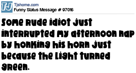 X Some rude idiot just interrupted my afternoon nap by honking his horn just because the light turned green.