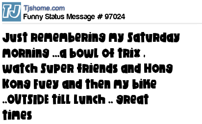 X is Just remembering my Saturday morning ...a bowl of trix , watch Super friends and Hong Kong Fuey and then my bike ..OUTSIDE till lunch .. great times