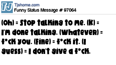 - # 103991 Texting 101: (Oh) = stop talking to me. (K) = I'm done talking. (Whatever) = f**k you. (Fine) = f**k it. (I guess) = I don't give AF.