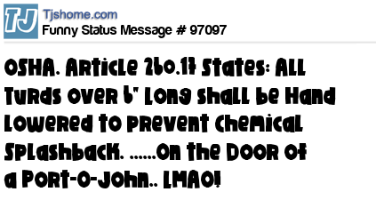 X  OSHA. Article 260.17 States: All Turds over 6" Long shall be Hand lowered to prevent Chemical Splashback. ......On the Door of a Port-O-John.. LMAO!