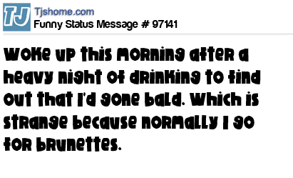 X says Woke up this morning after a heavy night of drinking to find out that I'd gone bald. Which is strange because normally I go for brunettes.