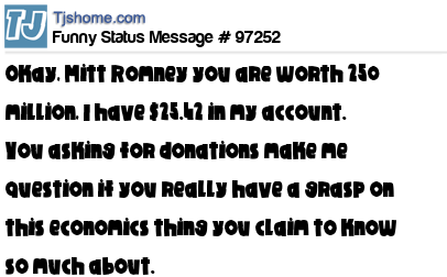X says Okay, Mitt Romney you are worth 250 million, I have $25.42 in my account. You asking for donations make me question if you really have a grasp on this economics thing you claim to know so much about.