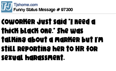 X  Coworker just said "I need a thick black one." She was talking about a marker but I'm still reporting her to HR for sexual harassment.