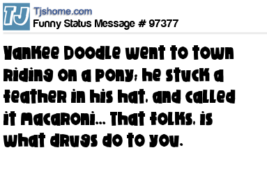 X Yankee Doodle went to town riding on a pony; he stuck a feather in his hat, and called it macaroni... That folks, is what drugs do to you.