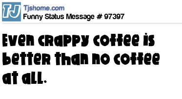 - # 166064 I love how coffee fixes everything. Tired? Drink some coffee. Headache? Drink coffee. Cold? Drink coffee. Someone makes your angry? Bust them in the head with the cup!!!