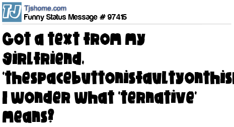 X Got a text from my girlfriend, 'thespacebuttonisfaultyonthisphonecanyoupleasegivemeanalternative.' I wonder what 'ternative' means?