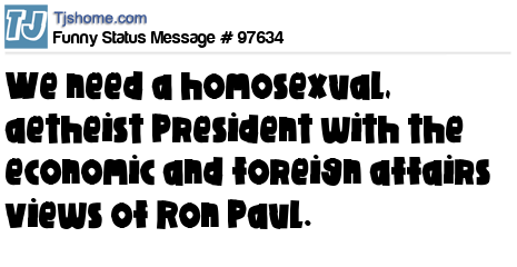 X says We need a homosexual, aetheist President with the economic and foreign affairs views of Ron Paul.