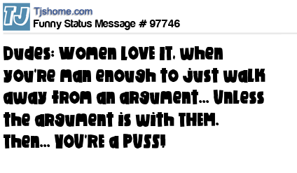 X Dudes: Women LOVE IT, when you're man enough to just walk away from an argument... Unless the argument is with THEM. Then... YOU'RE a PUSS!