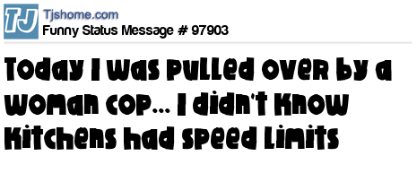 - # 84677 I was pulled over by a woman cop this morning. Never knew kitchens had speed limits.