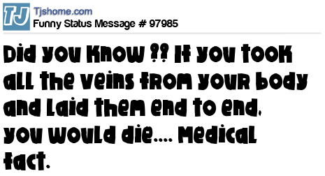 - # 109989 Science Fact: If you took all the veins from your body and laid them end to end, you would die