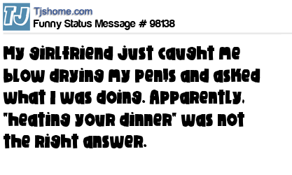 - # 91887 My girlfriend just caught me blow drying my pen!s and asked me what was I doing...apparently "heating your dinner" wasn't the right answer.