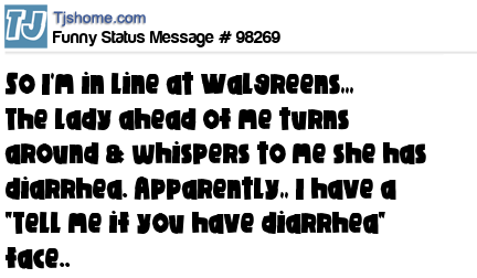 X So I'm in line at Walgreens,,, The lady ahead of me turns around & whispers to me she has diarrhea. Apparently,, I have a "Tell me if you have diarrhea" face..
