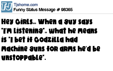 X Hey Girls,,, When a guy says "I'm listening",, what he means is "I bet if Godzilla had machine guns for arms he'd be unstoppable".