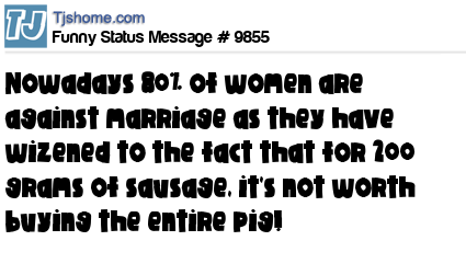- # 35736 For all those men who say, Why buy a cow when you can get milk for free. Here's an update for you: Now days, 80% of women are against marriage, WHY? Because women realize it's not worth buying an entire pig just to get a little sausage.