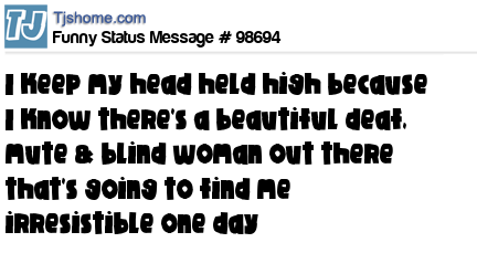 X I keep my head held high because I know there's a beautiful deaf, mute & blind woman out there that's going to find me irresistible one day