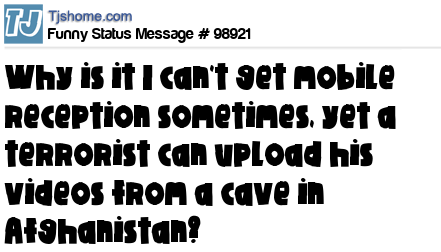 - # 94651 Why is it I cant get a mobile reception in my house in town, yet a terrorist can upload his vids from a cave in Afganistan? Is there a terrorist mobile tariff I can go on??