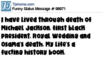 X is I have lived through death of Michael Jackson, first black president, Royal Wedding and Osama's death. My life's a fuc?ing history book.