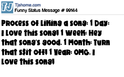 X is Process of liking a song: 1 Day: I love this song! 1 Week: Hey that song's good. 1 Month: Turn that s$it off! 1 Year: OMG, I love this song!