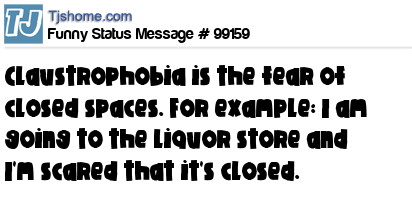 X says Claustrophobia is the fear of closed spaces. For example: I am going to the liquor store and I'm scared that it's closed.