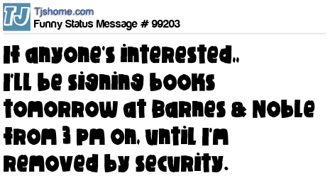 - # 120669 For anyone interested , I will be signing books at Barnes and Noble from 6PM until I am escorted out by securuty