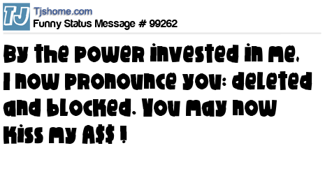 - # 53474 By the super powers vested in me... I can now pronounce you deleted on fb and blocked if I want to.