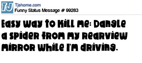 X Easy way to kill me: Dangle a spider from my rearview mirror while I'm driving.