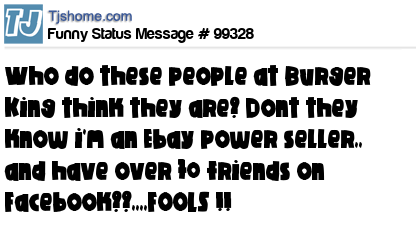 X  who do these people at Burger King think they are? Dont they know i'm an Ebay power seller,, and have over 70 friends on Facebook??,,,,FOOLS !!