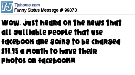 X is wow, just heard on the news that all gulliable people that use facebook are going to be charged $17.95 a month to have their photos on facebook!!