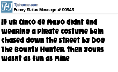 X If ur Cinco de mayo didnt end wearing a pirate costume bein chased down the street by Dog The Bounty Hunter, then yours wasnt as fun as mine