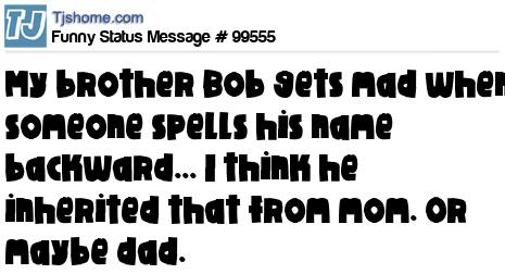 X My brother Bob gets mad when someone spells his name backward... I think he inherited that from mom. Or maybe dad.