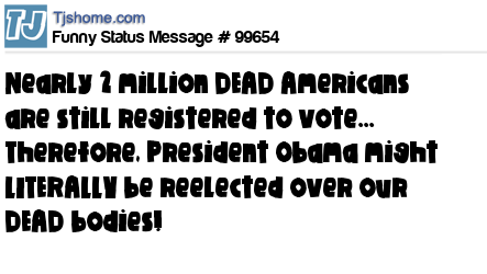 X Nearly 2 million DEAD Americans are still registered to vote... Therefore, President Obama might LITERALLY be reelected over our DEAD bodies!