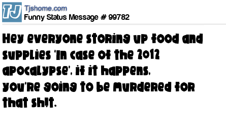 X says Hey everyone storing up food and supplies 'In case of the 2012 apocalypse', if it happens, you're going to be murdered for that sh!t.