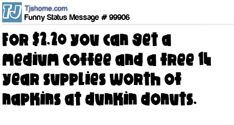 X For $2.20 you can get a medium coffee and a free 14 year supplies worth of napkins at dunkin donuts.